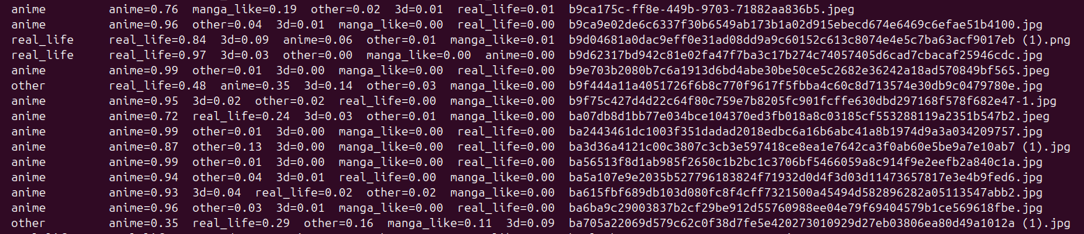 sort_images.py — Sort images into categories using cafeai/cafe_style. Output folders match the model's official label names: anime/ anime illustration art real_life/ photographs of real people/scenes 3d/ 3D rendered art manga_like/ manga style black & white art other/ everything else, plus low-confidence results bad_files/ unreadable files with corrupt headers or unsupported formats Usage: python sort_images.py /path/to/images [options]