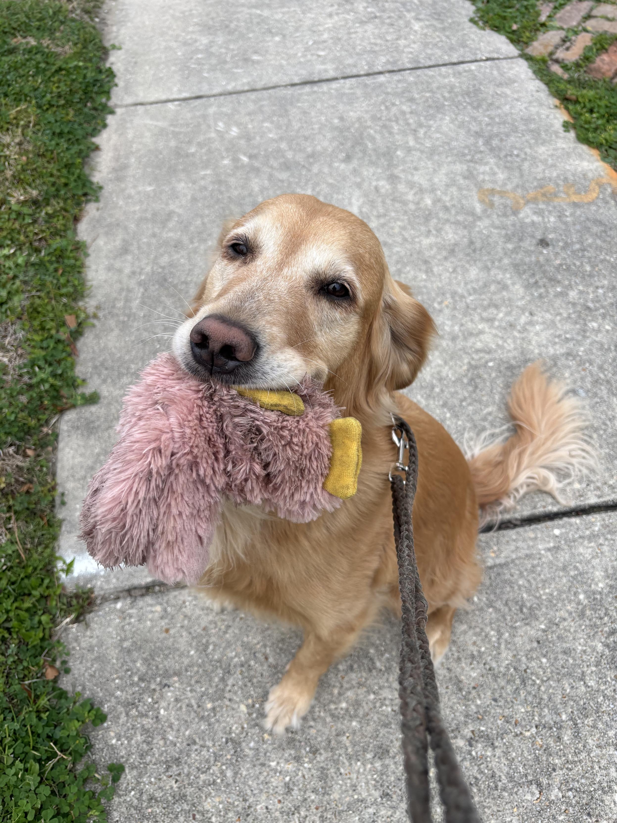 Phoenix says the chicken needs fresh air, too. She's making sure to pick a new animal friend each time for her fun walks, and today Mr. Pink Chicken is the winner.