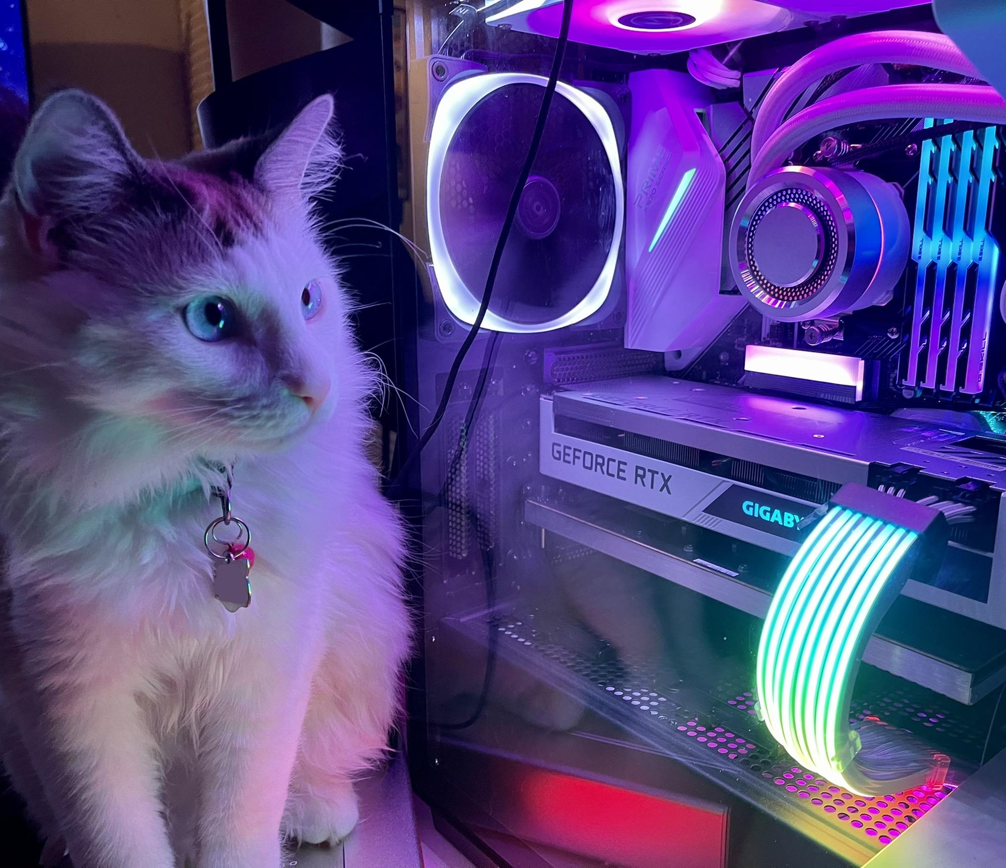 Thomas 🔭🕹️ (thomasfuchs@hachyderm.io)'s status on Monday, 27-Oct-2025 10:54:07 JST  Thomas 🔭🕹️ Thomas 🔭🕹️Well ripped out the broken COU cooler in my gaming PC and replaced it with a new AIO and PC works great again (or whatever counts as "great" wrt to Windows 11). I haven't fully restored the RGB barf inside, working on it; meanwhile enjoy a picture of Eero a few years ago.