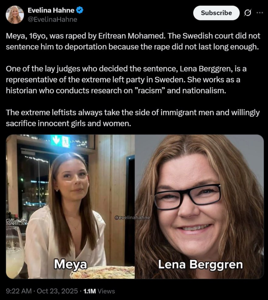 16-year-old Swedish girl Meija Åberg was raped by Mohamed, an 18-year-old Eritrean invader. He was set to avoid deportation after a Swedish court ruled the rape didn’t last long enough. One of the judges who decided the sentence, Lena Berggren, is a far-left antifa judge and a member of the the left-wing party in Sweden. She works as a "historian" who conducts research on ”racism” and nationalism.