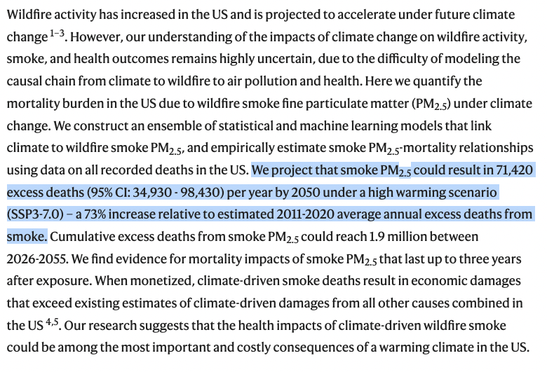 In the US, PM₂.₅ from wildfire smoke already kills about the same number of people as guns and cars (~40k each), but this will increase significantly with climate change. 😐