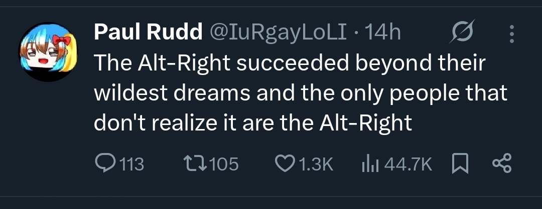 @white_male @Hoss @Escoffier My conclusion is just that things will accelerate on an indefinite timeline. There's no "happening" in a sense that a revolution will occur (granted I don't know what that'll look like). But I reject that any group has control of said acceleration yet high profile deaths/assassinations will continue to occur.