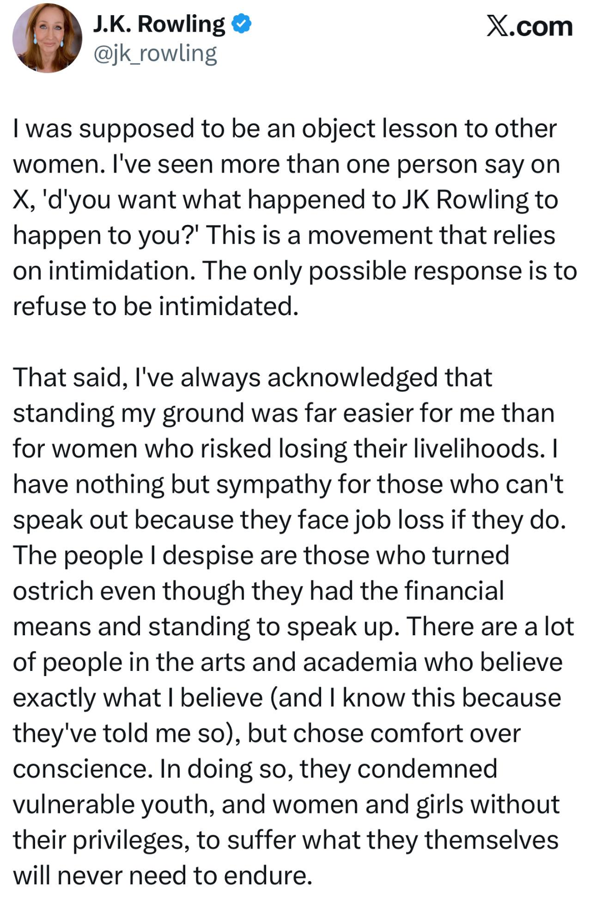 "I was supposed to be an object lesson to other women. I've seen more than one person say on X, 'do' you want what happened to JK Rowling to happen to you? This is a movement that relies on intimidation. The only possible response is to refuse to be intimidated. That said, I've always acknowledged that standing my ground was far easier for me than for women who risked losing their livelihoods. I have nothing but sympathy for those who can't speak out because they face job loss if they do. The people I despise are those who turned ostrich even though they had the financial means and standing to speak up. There are a lot of people in the arts and academia who believe exactly what I believe (and I know this because they've told me so), but chose comfort over conscience. In doing so, they condemned vulnerable youth, and women and girls without their privileges, to suffer what they themselves will never need to endure."