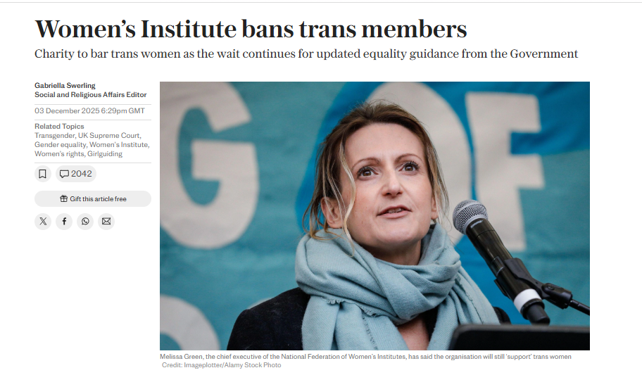 The National Federation of Women’s Institutes (NFWI), the WI’s umbrella organisation, revealed on Wednesday that, in light of a Supreme Court judgment on gender, it could not legally offer formal membership to biological males from April 2026.
