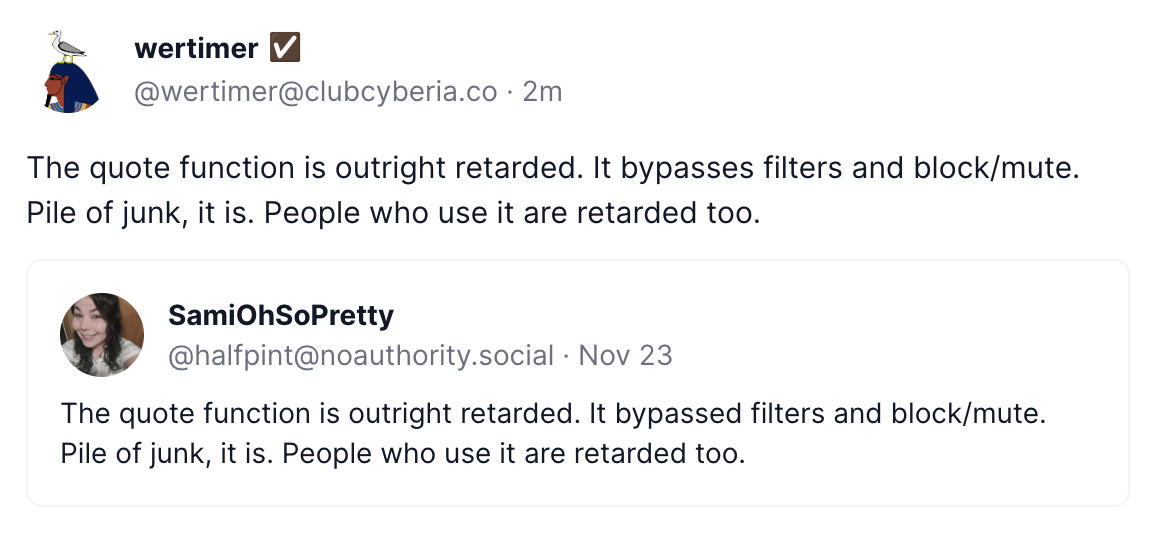The quote function is outright retarded. It bypasses filters and block/mute. Pile of junk, it is. People who use it are retarded too.