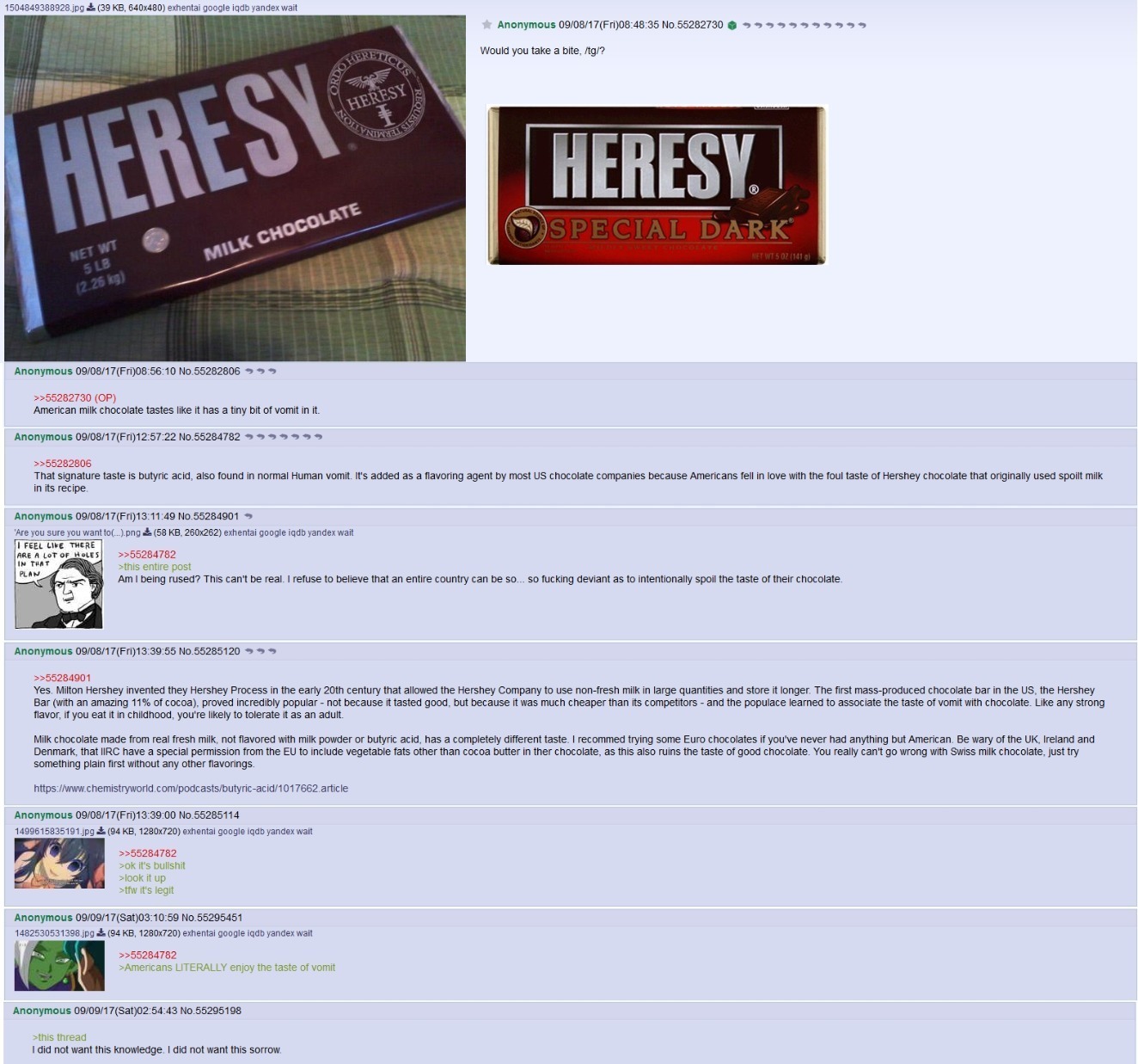 @Bunsen@King_Noticer@EdBoatConnoisseur@Lavaearth I love chocolate, but avoid stuff like Hershey and milk chocolate. Most dark chocolate is fine, but there is lots of 'chocolate' stuff that is more 'sugar-with-chocolate-flavor' than chocolate.
