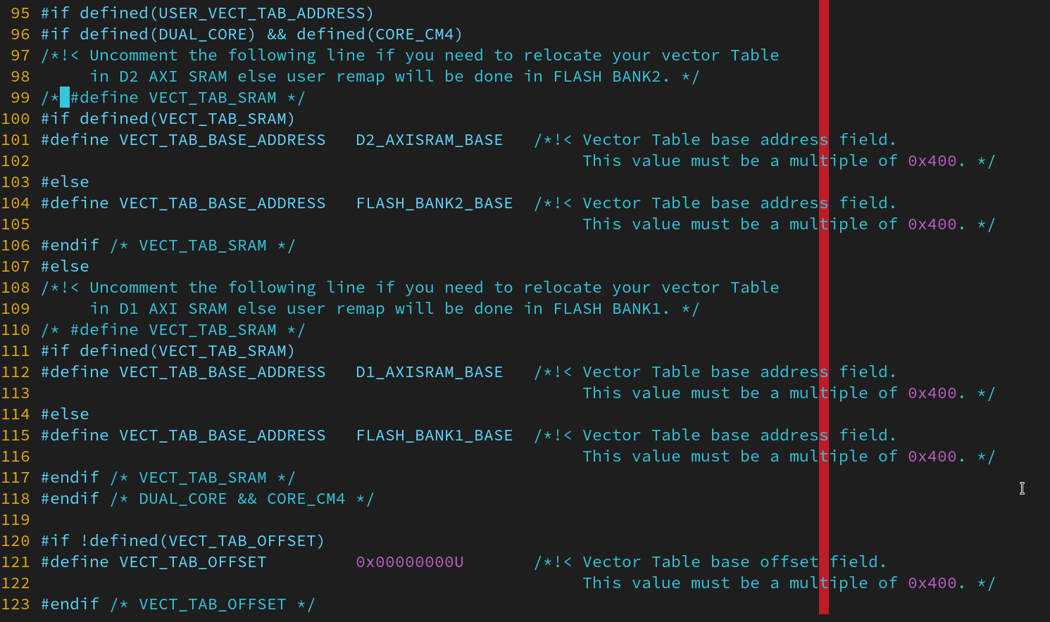 Keep optimizing IRQ latency on the STM32H743 @ 480 MHz. The 70 ns vs. 100 ns overhead mystery solved. I did not correctly relocate the vector table to Tightly-Coupled Memory properly, it was still in Flash. The STM32 HAL macro USER_VECT_TAB_ADDRESS is a flag, not a memory address! In fact, only several hardcoded addresses are available, a real user override is not provided (the name "user" is a lie). Solution: just change VTOR manually, don't trust the startup code. I'm now getting 70-ns IRQ without CPU cache. #electronics#STM32