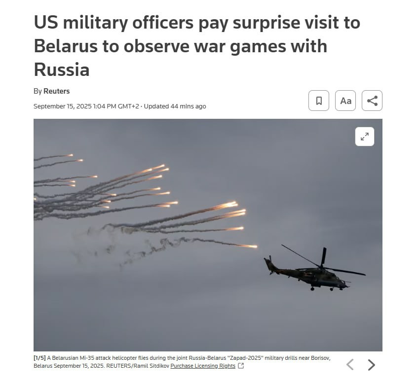 "En una acción sorpresiva, oficiales militares estadounidenses visitaron Bielorrusia para observar los ejercicios conjuntos ruso-bielorrusos "Zapad-2025" cerca de Borisov. El ministro de Defensa bielorruso, Viktor Khrenin, informó a los estadounidenses que tenían libertad para inspeccionar cualquier objeto de interés."