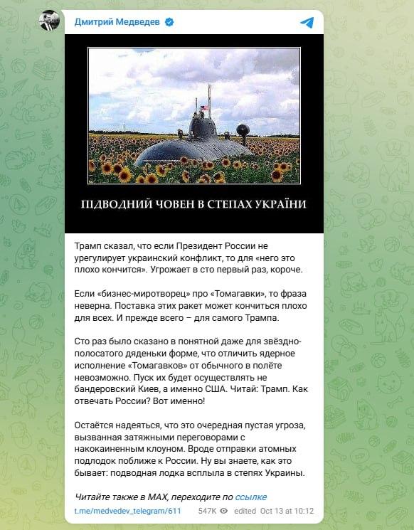 "Medvedev arremete contra Trump de nuevo, advirtiendo que cualquier entrega de misiles Tomahawk a Ucrania "podría acabar mal para todos, especialmente para el propio Trump". Afirma que Rusia no puede distinguir entre misiles Tomahawk convencionales y nucleares en pleno vuelo y amenaza directamente a Estados Unidos si se lanzan dichas armas. Medvedev califica los comentarios de Trump de otra amenaza vacía, atribuyéndolos a "conversaciones interminables con un payaso drogado"."