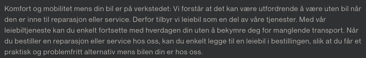 Det forstår bilverksteder, og tar hensyn til. Se hva dette verkstedet sier, feks (Ill 1). Her er det forståelse for at du fortsatt trenger transportmiddel mens ditt er inne, og de tilbyr seg å løse problemet for deg.