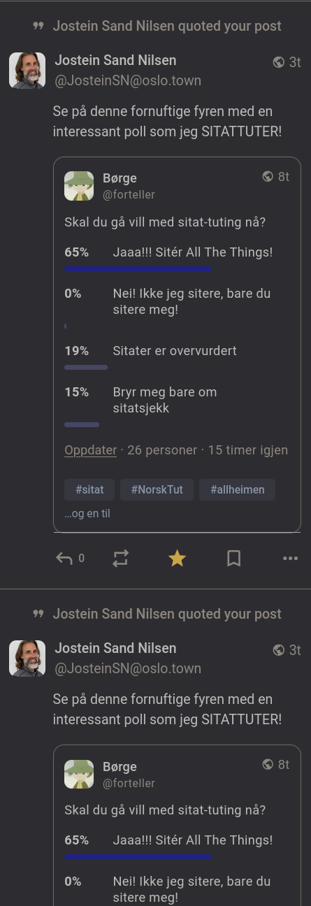 @cheeaun No, both quote posts have the same URL. And it's happened three times, while only once have I been quoted and only gotten one notification about it.