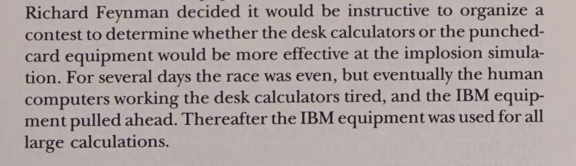 Feynman creates a John Henry contest: it's IBM punchcard computers vs women with mechanical desk calculators. The prize is an Atomic Bomb. The computer wins, and also the bomb works. So all the cool people know that henceforth it will be all about computers
