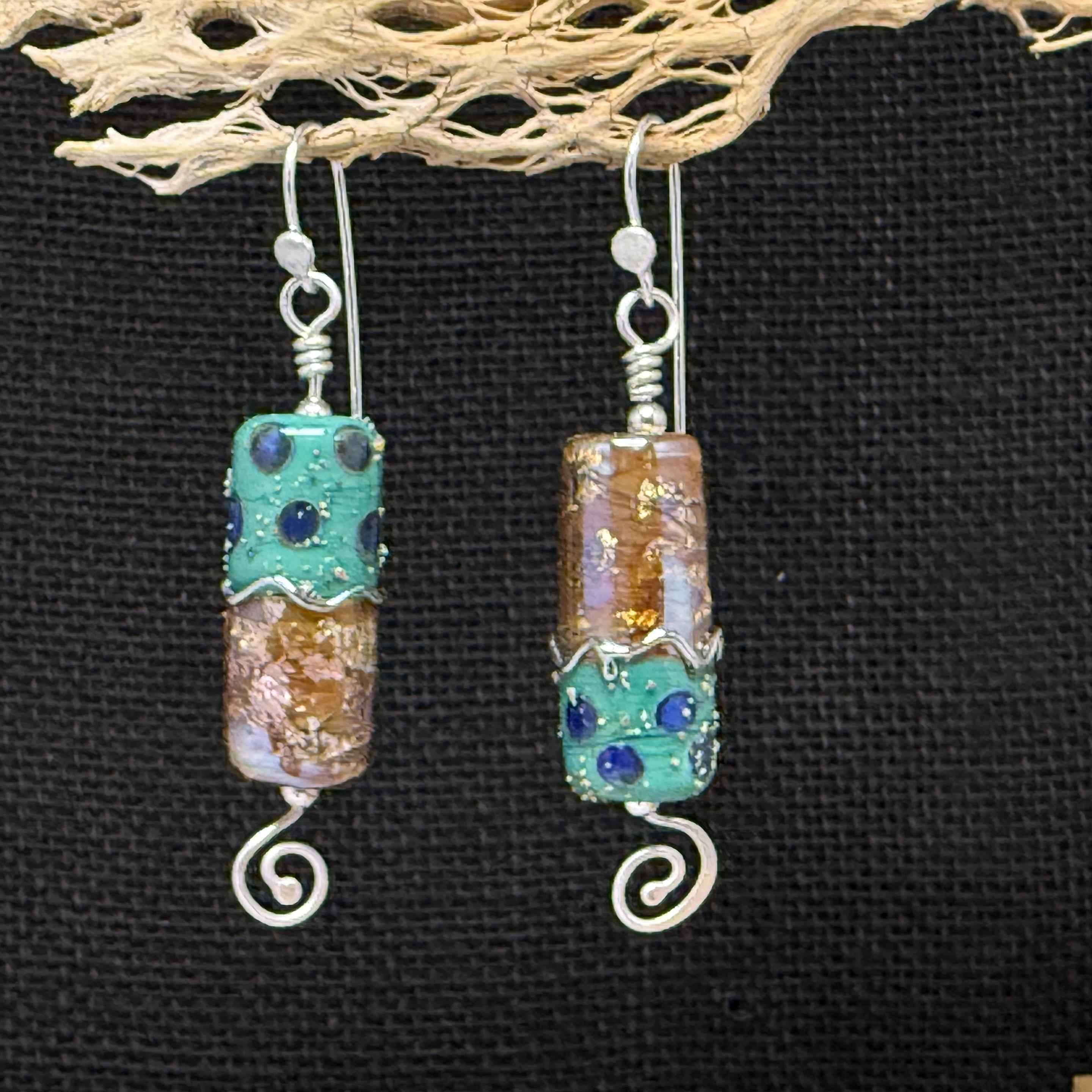 First up are the handmade glass bead and sterling silver earrings I made yesterday. The price reflects the high cost of the handmade beads. (Buying these supports two artists!)