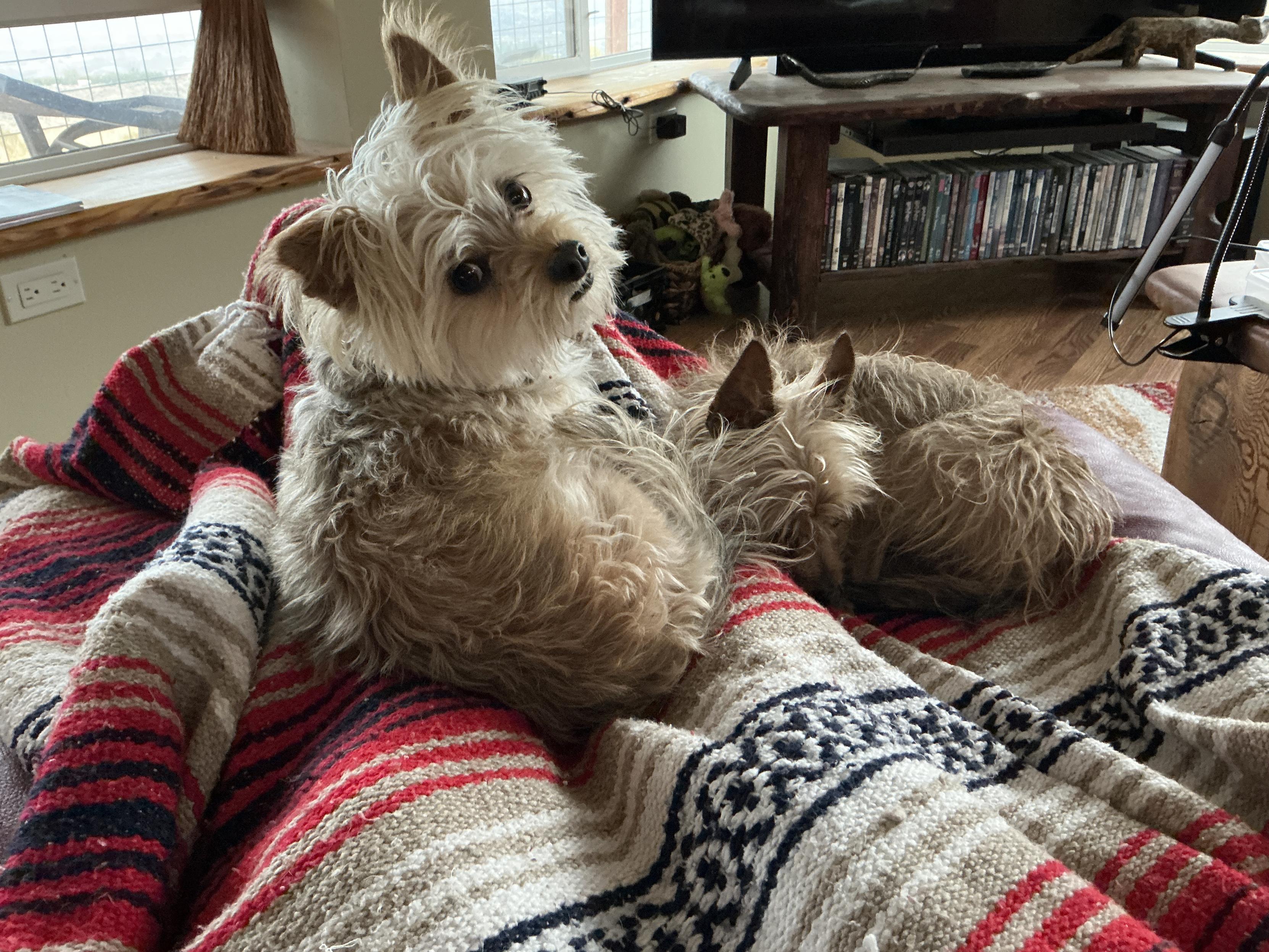 I've quit for the day. Sore back. ๐ Decided to sit on the sofa with a blanket over my legs and I immediately became a lounge spot for the girls. #DogsOfMastodon