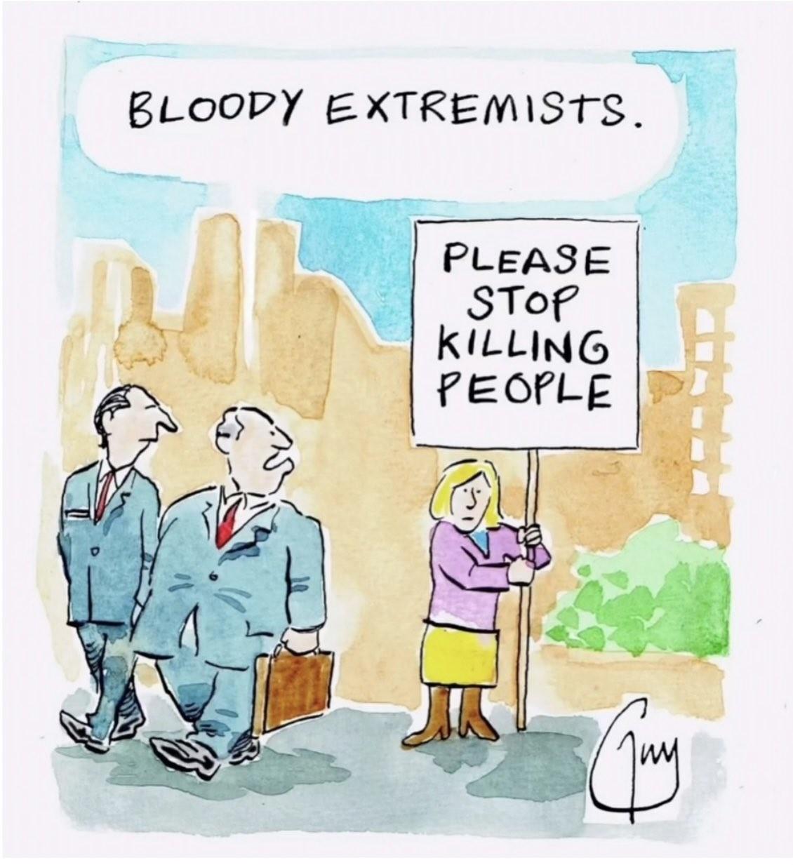 While this cartoon is probably referencing a particular activist group in the UK, it tends to hold true for others, protesting different issues non violently around the world.