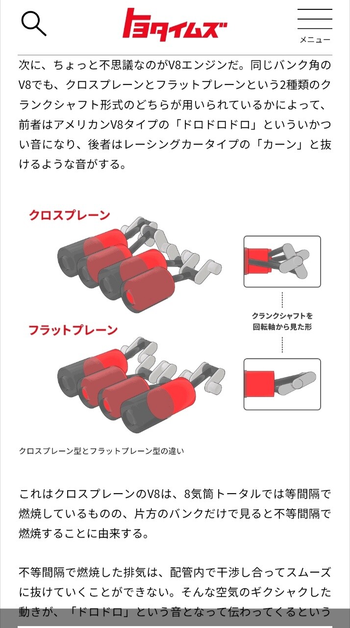 V8エンジンがドロドロ音かそうでないかはクロスプレーンかフラットプレーンかによる。