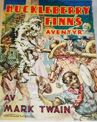 The grotesque cover illustration of this 1944 Swedish edition of "Huckleberry Finn" was incomprehensible to the target audience. Tarring and feathering is completely unknown to Swedes except in the context of this exact book. What are we really seeing here!?