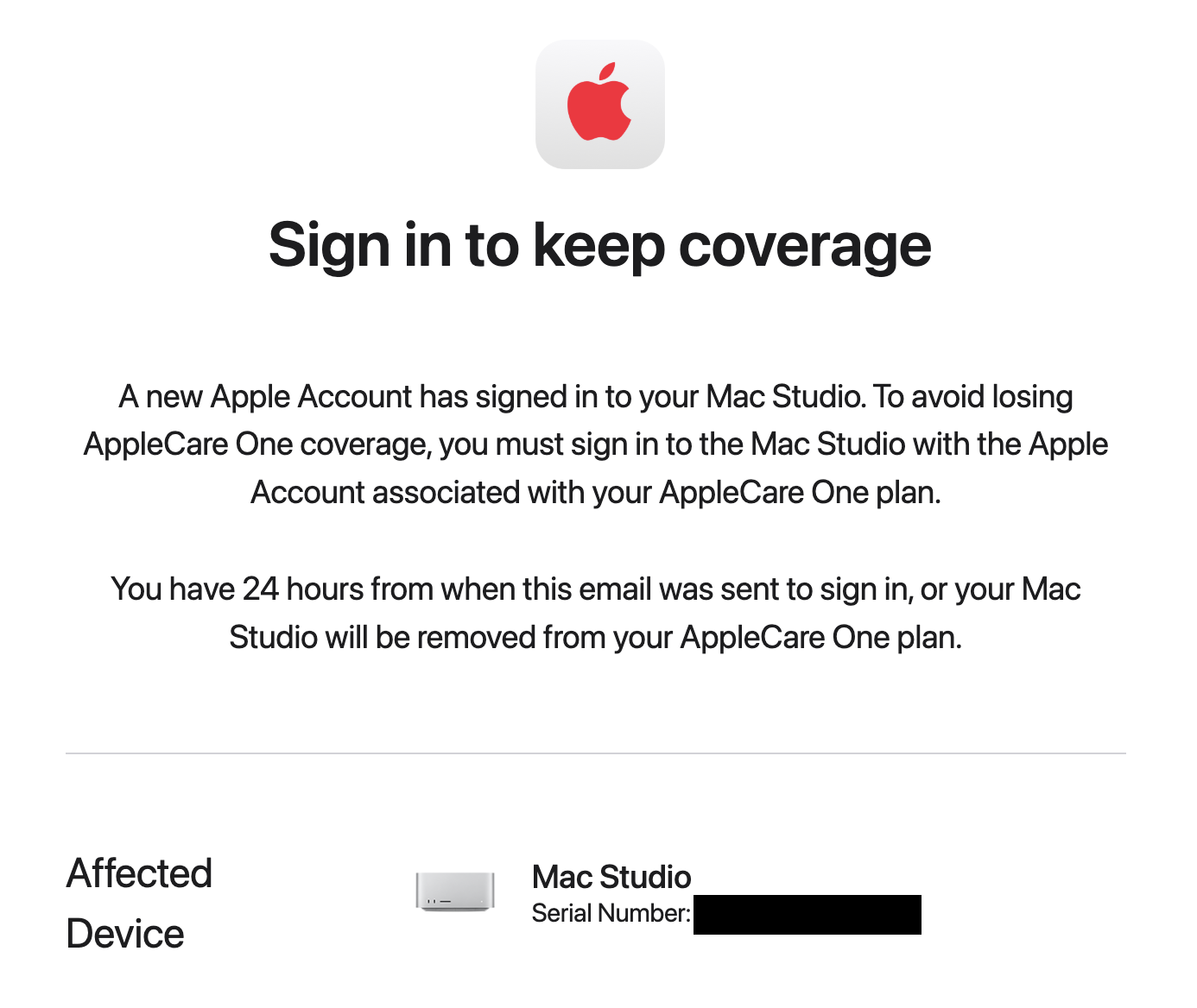 Speaking in as an individual and not for Apple, the support person said they hope there will be changes to the rules of AppleCare One because the support burden since AppleCare One was introduced is not sustainable. (Lots of people are getting these “24 hours to comply" emails and they don't understand why and are upset about it.)