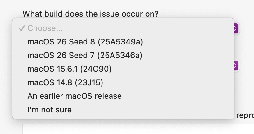 This is the complete list of macOS builds offered when filing a SwiftUI Feedback report. Many builds are missing, including the one I want to submit a report for (macOS 26.1 Beta (25B5042k)).