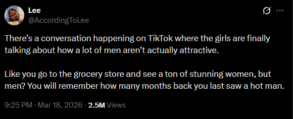 @histoire3 the average woman starts her day with like an hour dedicated to making herself look as good as possible. men should do more -