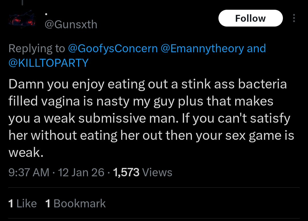@HatkeshiatorTND it's more the idea of being with a man who is physically repulsed by your genitalia. imagine being with a woman that was repulsed by your penis -