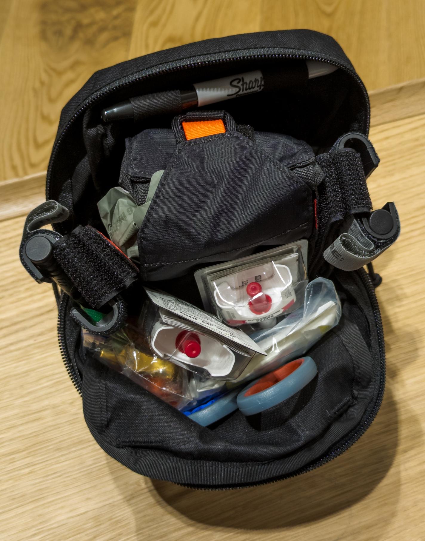 Inside, the tourniquets and shears are immediately accessible and the rest of the trauma essentials are in a pullout for fast access; booboo kit and secondary stuff is in ziplocks, and the stuff in the pullout is held in place with elastic so the contents don't go flying when I open it.