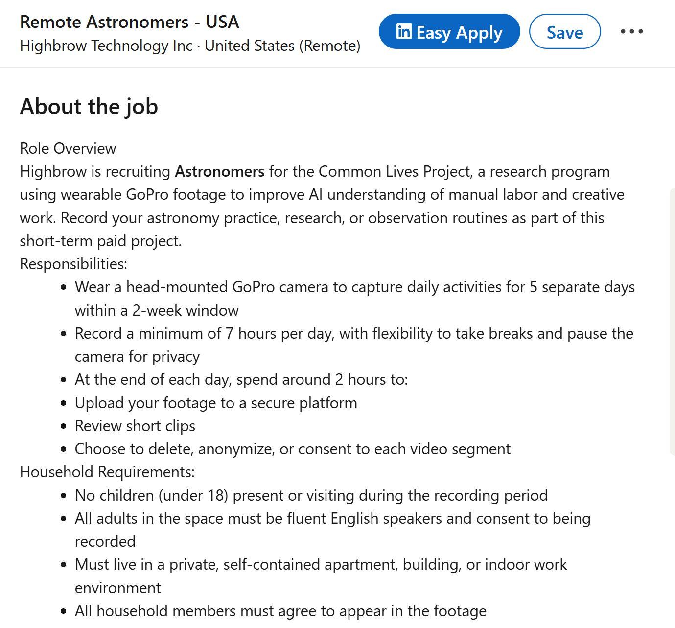What in the dYstOpia? "Recruiting Astronomers to wear a head-mounted GoPro and take footage for 7 hours a day to improve AI understanding of manual labor and creative work. Record your astronomy practice, research, or observation routines." This is a job LinkedIn recommended to me today. Are you F*%King serious? This is peak stupid. This must mean the dumb-tech bubble is bursting supernova-style?