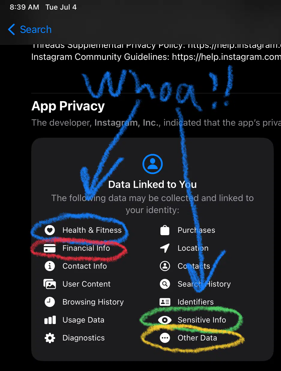 Threads by Instagram will launch on July 6th (thanks for the heads up @dansup@mastodon.social!) & I noticed Meta collects a lot of data. So much data!