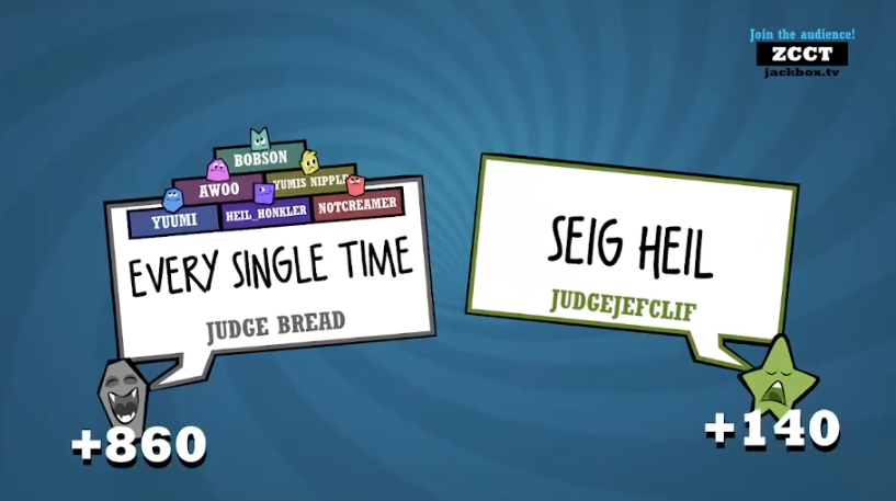 @p jackbox its a party game. somebody hosts and everybody joins in a browser on pc or phone and does their answers on that -